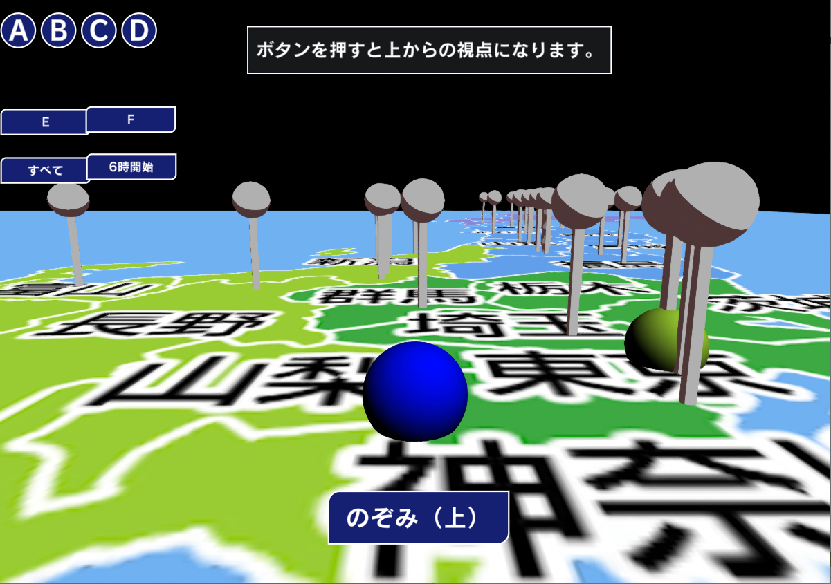 新幹線が通過する都市の高度を設定し、新幹線(下図の青い球)が高度に合わせて上下しながら地図上を動いていく様子を表現しています。作成される作品は圧倒的にゲームが多い中、アイデアがユニークです。