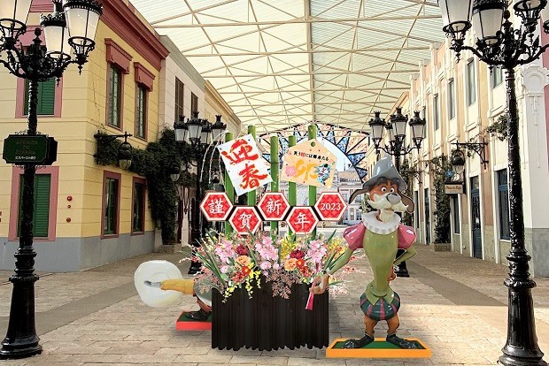 テーマパーク、ホテル志摩スペイン村、ひまわりの湯の入口に門松を設置し、皆さまをお迎えします。テーマパークの門松が新デザインとなり、2023年の干支である“うさぎ”をモチーフにしたキャラクター「チョッキー」の絵馬も飾られます。