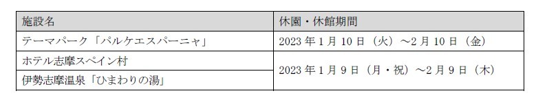 志摩スペイン村は下記の期間、休園・休館します。あらかじめご了承ください。