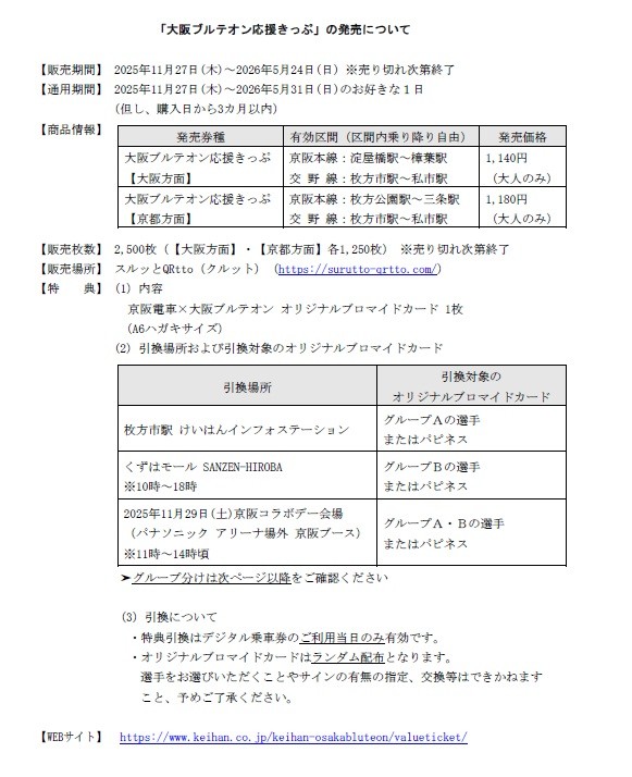 京阪グループ×大阪ブルテオン連携企画 11月27日(木)よりオリジナル特典付き京阪電車デジタル乗車券「大阪ブルテオン応援きっぷ」を発売!