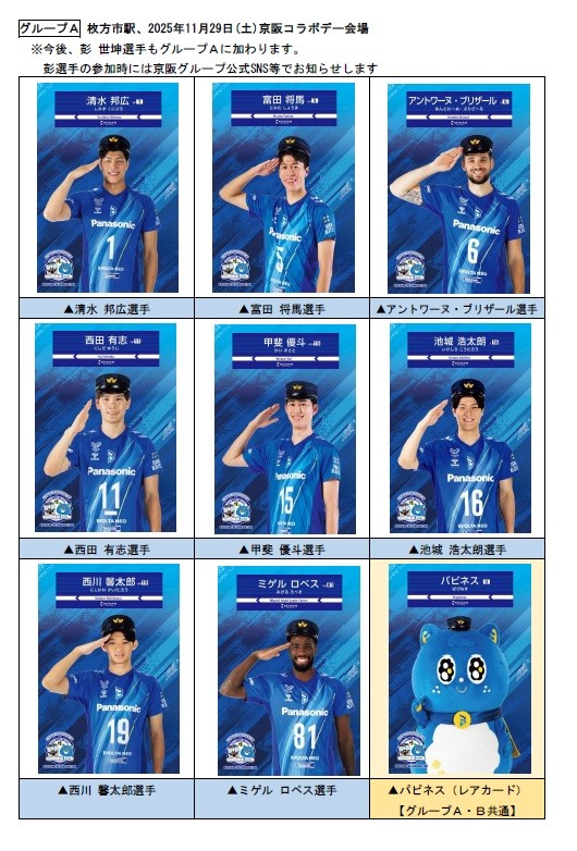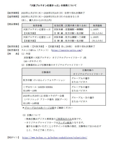 京阪ホールディングス株式会社(本社:大阪市中央区、社長:平川良浩)と京阪電気鉄道株式会社(本社:大阪府枚方市、社長:井上欣也)は、枚方市・寝屋川市・門真市・守口市・交野市をホームタウンとし、地域に根差しつつ世界を目指す男子バレーボールクラブ「大阪ブルテオン」とコラボレーションして、2025年11月27日(木)から2,500枚限定で選手のオリジナルブロマイドカード付きのデジタル乗車券「大阪ブルテオン応援きっぷ」を発売します。
