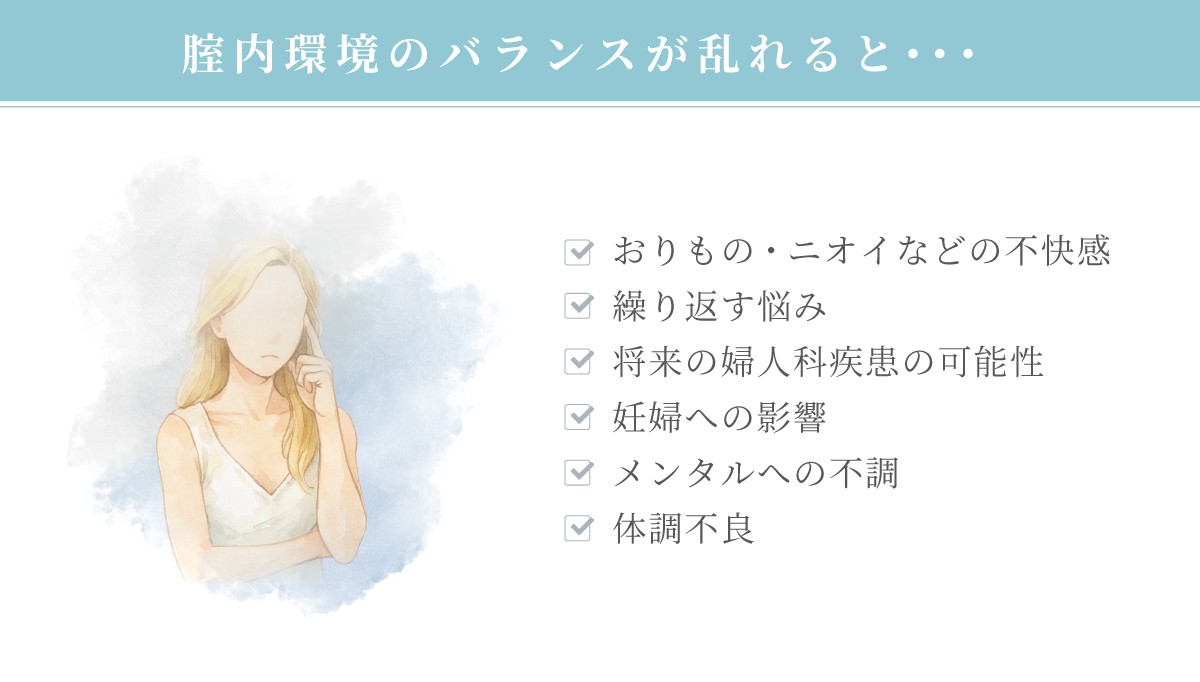 腟内には、独自のフローラ(細菌叢)が形成されており、腟内環境に大きな影響を与えています。健康な腟内には乳酸菌が優勢に存在し、腟内環境は弱酸性に保たれています。しかしながら、何らかの要因(ストレス、年齢、生理周期など)により乳酸菌の菌数が減少すると、腟内環境が乱れ雑菌が増殖しやすい環境になります。