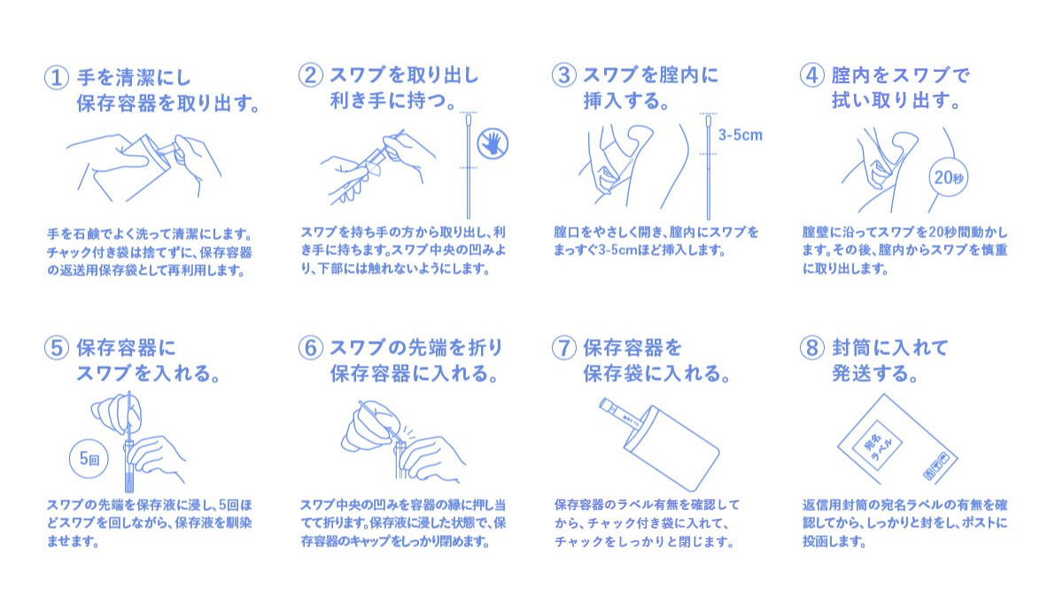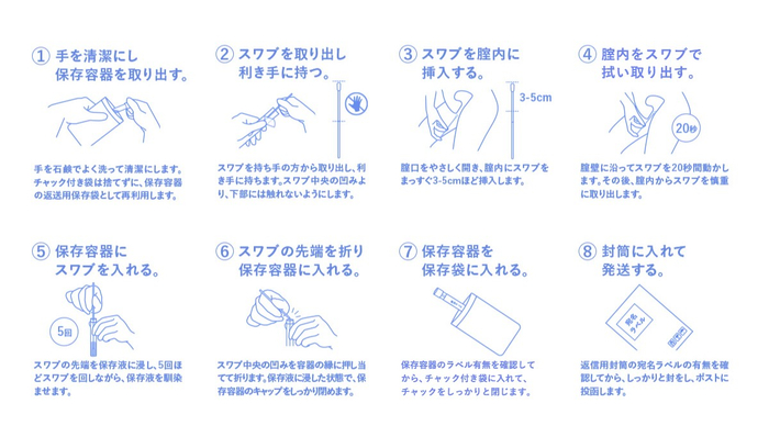 ご自身で簡単に実施できるよう設計されています。綿棒型のスワブを使用するため、一般的に痛みはほとんどありません。詳細な実施方法は以下の画像をご覧ください。