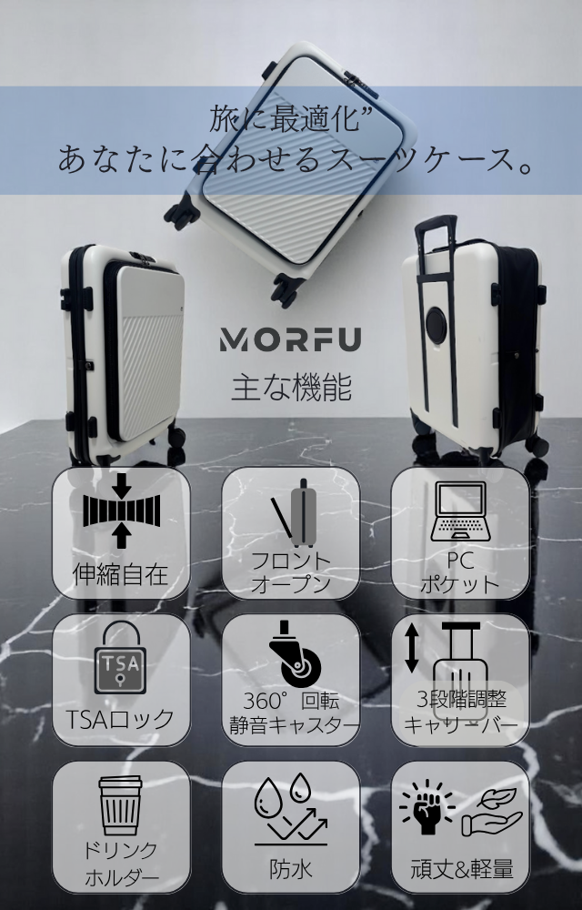 「“欲しい機能”だけを、全部まとめたスーツケースを作りたい」「出張や旅行で感じていた“あと一歩の不便”を解決したい」そんな想いから開発がスタート。実際の利用者の声や、SNSでの調査をもとに、「あったら嬉しい機能」だけを厳選して詰め込みました。「荷物の増減に対応できる柔軟さ」や「省スペースでの収納性」など、MORFUは、現代の多様なライフスタイルに寄り添う、“実用主義”のスーツケースです。