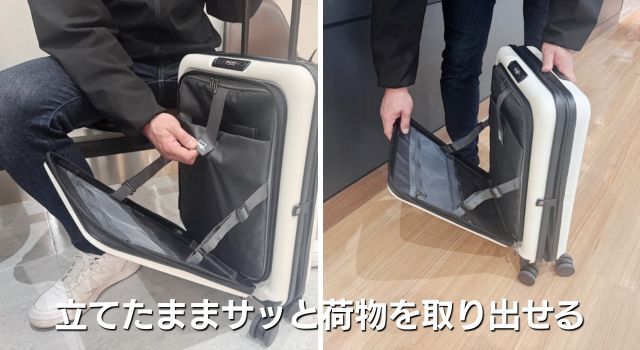 ・フロントオープン構造:PCや書類にすぐアクセスできるので、空港や新幹線での移動時もスマート。