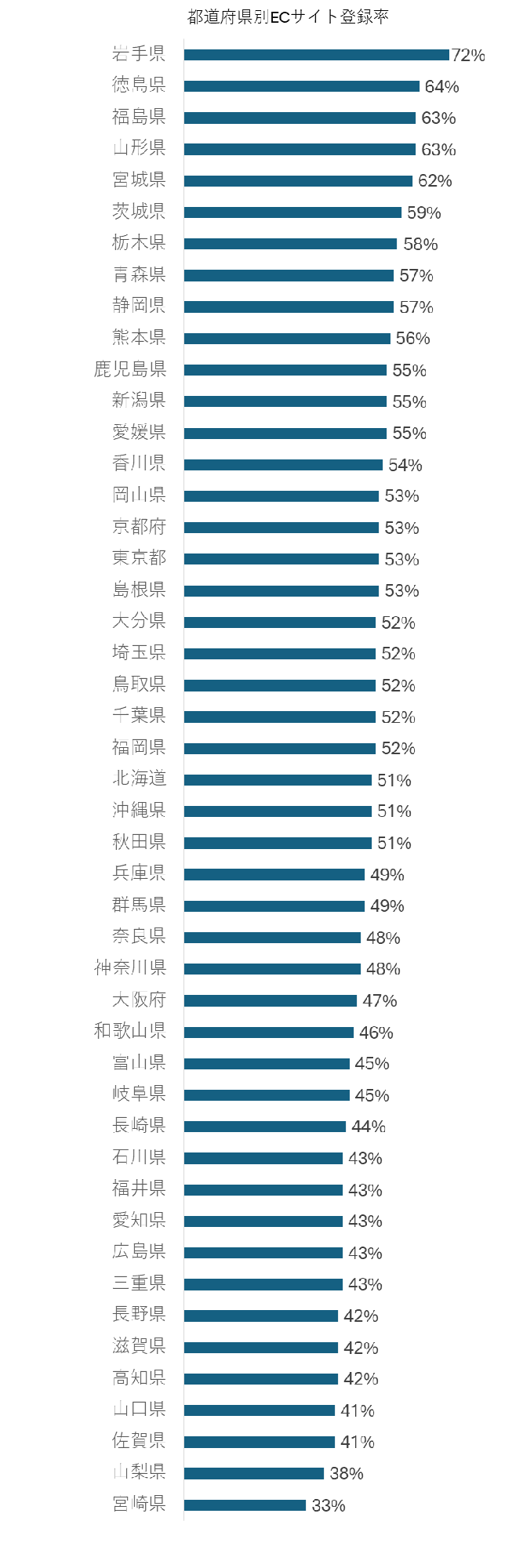 東北・四国・九州エリアでは登録率が50%を超える県も多く、岩手県や徳島県では60%を超える水準となっています。都市圏においても利用は着実に進んでおり、地域規模にかかわらずECを活用した購買体制の整備が進展していることがうかがえます。