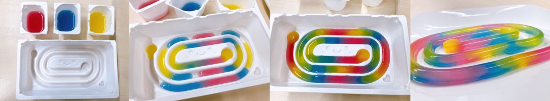 トレーにグミ液を注ぐと、3色が混ざり合って世界に一つだけのオリジナル虹色グミが作れます。色の広がり方は毎回違うので、何度でも新しい発見があります。また、出来上がったグミは横からみると流し込んだいろのもとの広がりやグラデーションがとてもきれいなので、見どころポイントです。