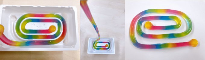 ・赤・青・黄色のグミ液を注ぐだけで、世界に一つの虹色グミが作れる