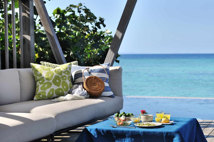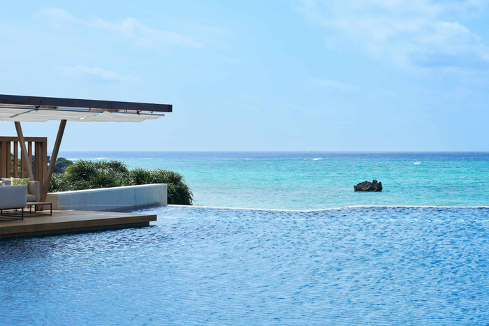 ランチを楽しむ席は、海を臨むプールサイドの最も海に近い場所に特別席を用意します。秋の沖縄は、日差しが穏やかになり暑さが和らぐため、屋外で快適に過ごせる時期です。また西海岸に面したプールからは、青く鮮やかな海を眺めることができます。開放感のある特別席で、心地よい海風を感じながら目の前に広がる海を眺め、シークヮーサーの香りとともにランチを味わいます。