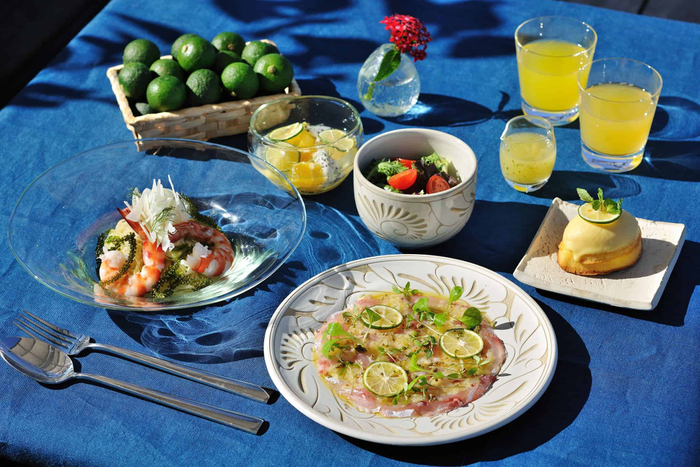 シークヮーサーをふんだんに使用したコース仕立ての特別メニューを提供します。香り成分を多く含む果皮を使用したハーブティーから始まり、爽やかな香りがリラックスした気分へと導いてくれます。メインは「車エビとシークヮーサーのカッペリーニ」です。カッペリーニを冷たく仕立て、シークヮーサーの爽やかな香りと共に味わいます。他にも果皮まで余すことなく使用したオリジナルのドレッシングや、オレンジ色の完熟したシークヮーサーを使ったドリンクなど、多彩なアレンジでシークヮーサーを堪能します。シークヮーサー本来の香りが引き立つメニューは、食事中も香りによる安らぎを感じられる爽やかなランチです。