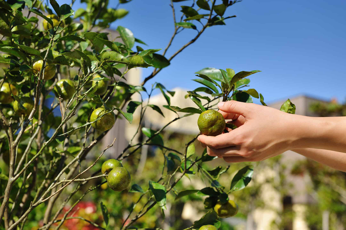 敷地内には、沖縄に馴染みのある果樹や草花が育つ畑と庭が広がっています。ランチの前に、星のや沖縄スタッフと一緒に敷地内を散策し、収穫時期による味わいの違いや名前の語源など、シークヮーサーにまつわる話を聞きます。庭のシークヮーサー畑では、果実をもぎとって、フレッシュな香りを楽しむことができます。