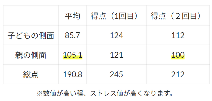 また、親の側面においては、「親の役割によって生じる規制」や「親の健康状態」の項目が特に数値が高かったことから、自分の思い描く育児のようには子どもが言動してくれない為に、親としての役割を担う時間も労力も奪われ、親御さん自身が心身の疲労をきたしている状態でした。