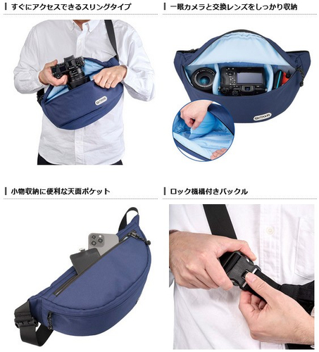 サッと前に回してすぐにアクセスできる斜め掛けスリングタイプのカメラバッグです。カメラを保護しながら軽快に持ち運べるわずか約270gの超軽量設計。体にぴったりフィットしてブラブラしないデザインは、街歩きでの気軽なスナップ撮影をはじめ、普段使いから旅行まで幅広いシーンで活躍します。ベルトバックルには、誤動作による思わぬ落下や盗難を防ぐ「ロック機構付きバックル」を採用。カメラ機材を安心して持ち運べます。