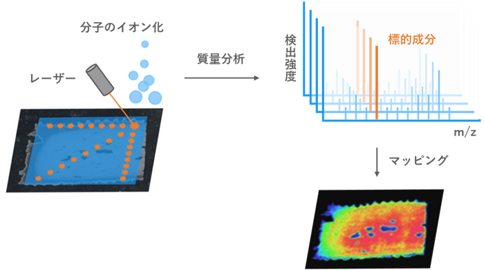 試料表面を細かい点毎に分析し、そこに存在する分子の分布をマッピングする可視化技術です。レーザーで分子を飛ばして、質量を測定し(MALDI-TOF Mass Spectrometry)、出た結果を色分けして画像にします。
