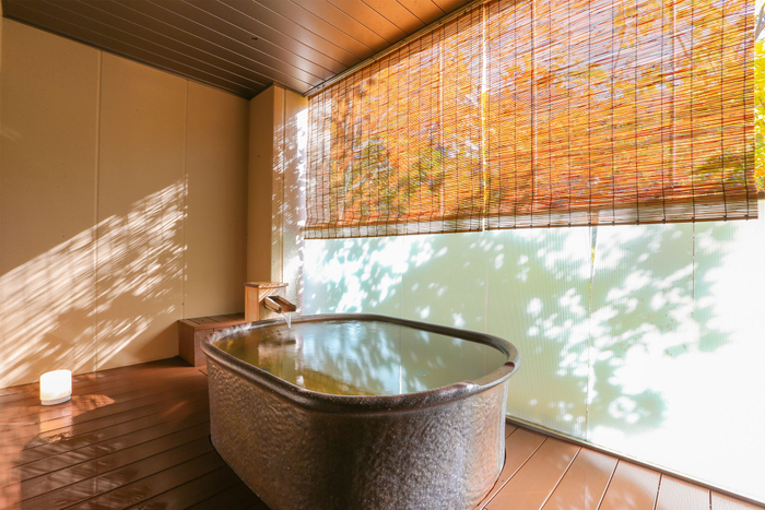 大理石の浴槽と、岩風呂の2種の貸切風呂を計4ヶ所ご用意しております。特に静かになる夜の入浴は、温泉が流れ落ちる音が心地よいBGMになり、心も体も安らぐ時間をお過ごしいただけます。