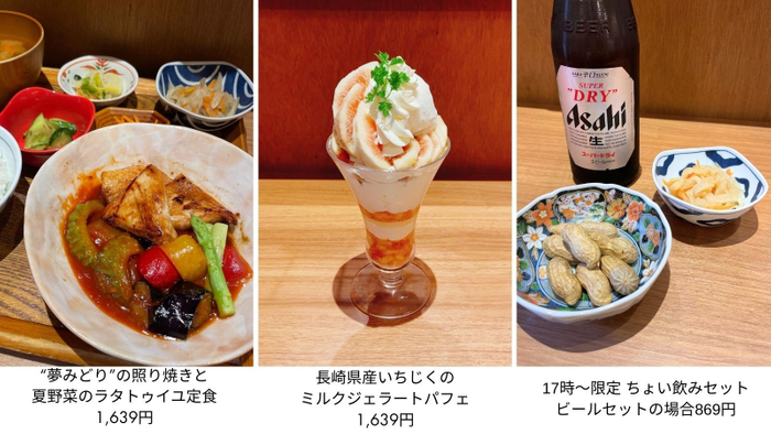 フェアでは、島原半島で生産された野菜を使用した「夏野菜のラタトゥイユ定食」、旬のいちじくを味わえる「いちじくのミルクジェラートパフェ」、定食のお惣菜にはJA島原雲仙管内で生産された夏野菜を使用して提供します。また17時からの限定企画となる「ちょい飲みセット」では同JA管内で生産された「落花生」を含む小鉢とお好きなアルコール飲料を選べるお得なセットメニューを提供します。