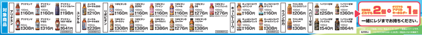 期間中、対象のドリンク剤を2個購入毎に、キャンペーン限定の「アクリルキーホルダー」よりお好きな絵柄を1個もらえます。本キャンペーンで初登場のかわいいうまミニをデザインに使用。