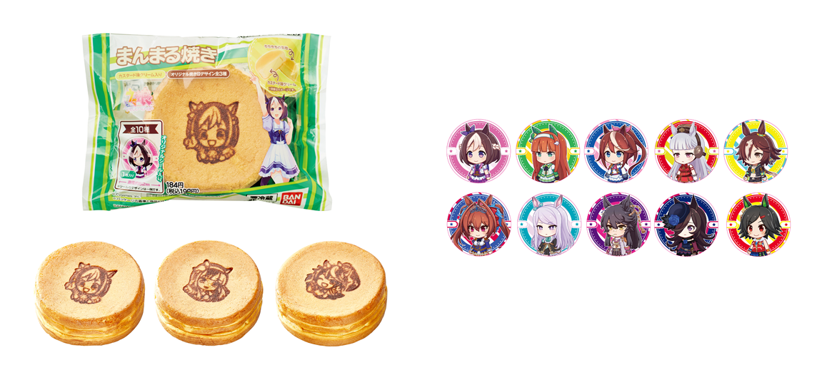 ウマ娘 プリティーダービー まんまる焼き(カスタード味クリーム入り)(左)、オリジナルデザインシール(右)