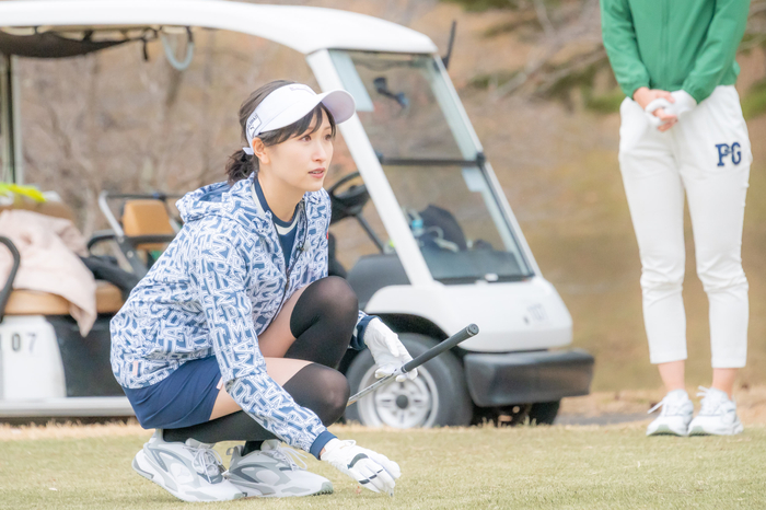 ゴルフ歴2年だというCOCOさん。苦手なアイアンを避けて挑んだティーショットは、その雰囲気からは想像できない豪快なスイング!一同からの歓声を受け、安心した表情を向けた。続く横山さんは、「細いのにパワフル」という米澤プロのコメント通り、まっすぐに飛ぶナイスショット。星さんのティーショットもしっかりボールを運び、全員が素晴らしいティーショットを披露する。ゴルフの腕前は芸能界NO1との呼び声も高い阿部さんと、Yoshimiさんが奮闘するも、米澤プロがグリーンにのせる流石のショットを披露したことで、他ペアを引き離しパーで1番ホールを終える。