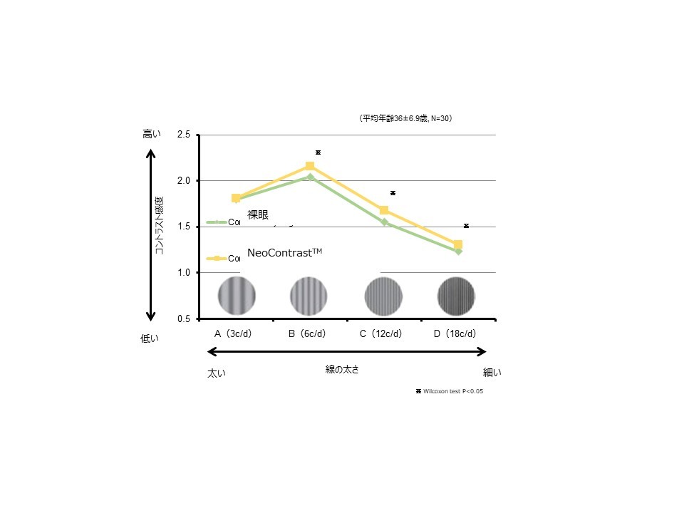 健常被検者を対象に実験したところ、NeoContrast(TM)を使用した時の方が、コントラスト感度が向上することが分かりました。