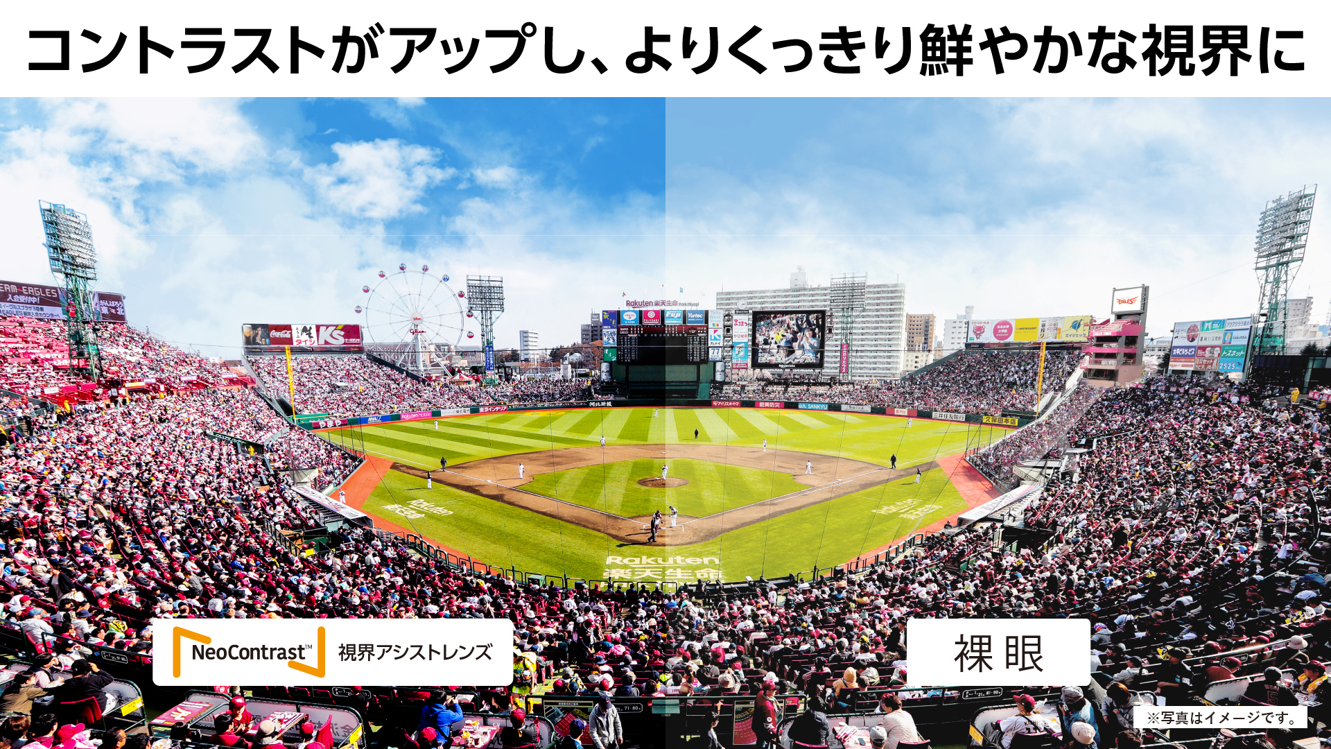 楽天生命パーク宮城でのナイトゲームにおいて、観客を対象にNeoContrast(TM)のスポーツグラスの使用モニターを実施※4したところ、9割を超える観客から、「よく見える」効果を感じるという回答が得られました。また、見え方についての質問で、4割を超える観客から「鮮やかに見えた」、「くっきり見えた」といった回答や、「投球やフライなど上空の打球のボールが良く見えた」との回答が得られました。一部の観客から臨場感や立体感が高まるとの声も得られています。