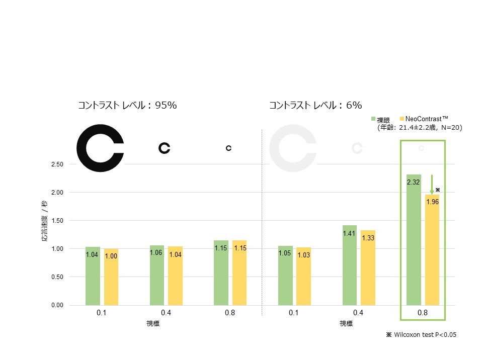 健常被験者を対象に、視力応答速度(視力検査で使用している輪《ランドルト環》の切れ目方向を答える時の応答速度)を測定したところ、NeoContrast(TM)を使用した時の方が、より小さく薄い視標が早く認識できることが分かりました。