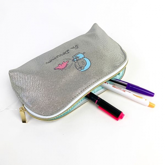 シックなシルバー調のペンポーチも♪こちらは、中央に恐竜とドラえもんがデザインされています。巨大な恐竜をスモールライトで小さくしたところでしょうか?