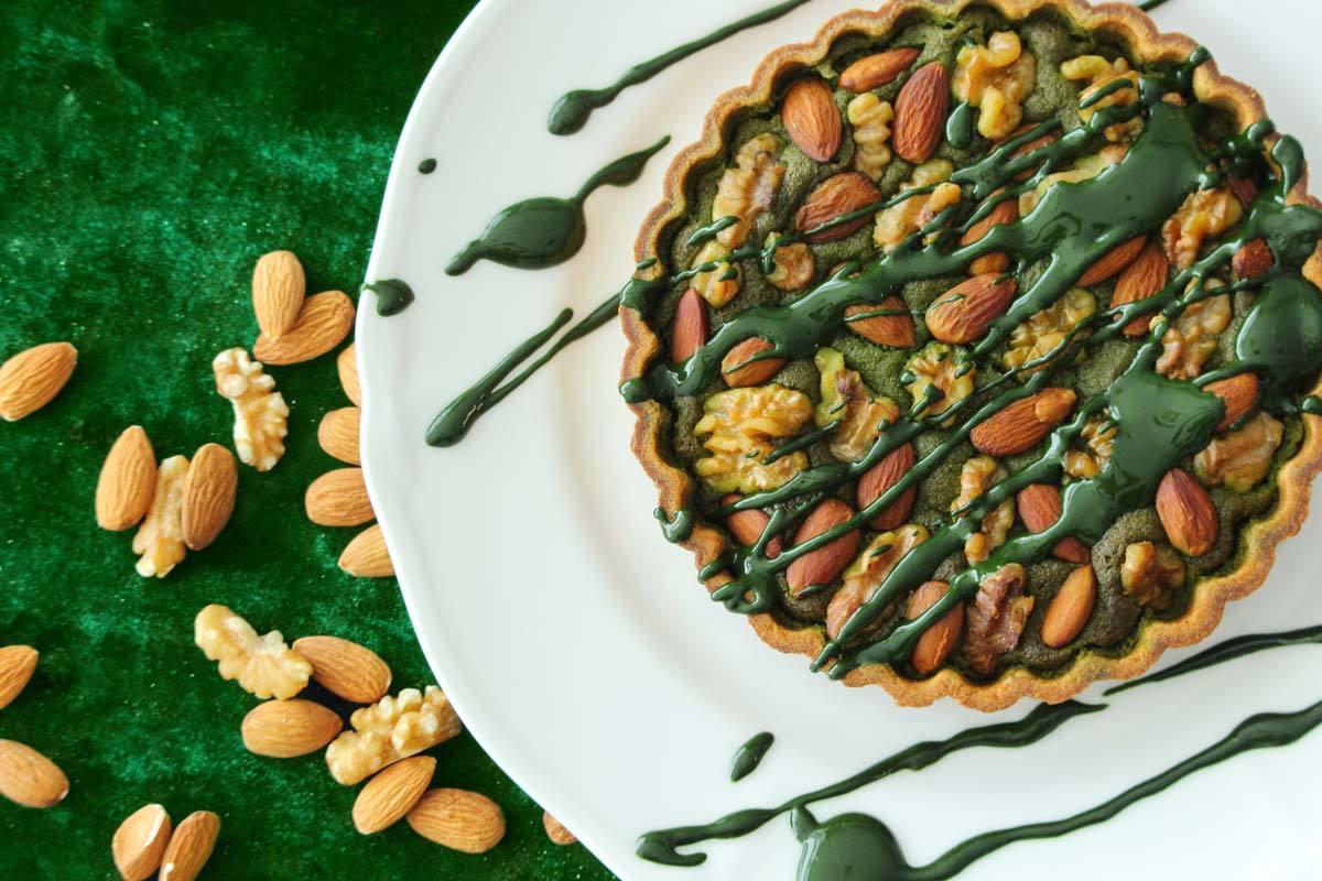 タルトの上には、アーモンドとクルミを一面に敷き詰めました。あえてカットせずに載せることで、素材のごろごろ食感が楽しめます。