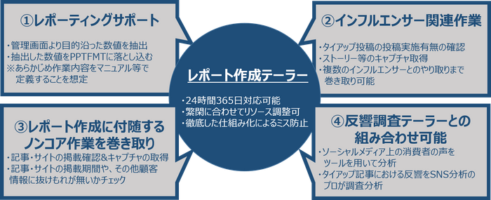 このような背景から、媒体社の報告レポート作成にまつわるあらゆる業務をトータル的にサポートする「レポート作成テーラー」の提供を開始いたします。本サービスでは管理画面からの掲載結果数値の抽出・レポーティング作業はもちろん、報告書に必要なキャプチャの取得や、ソーシャルリスニングツールを用いた統計作業、総括コメントの入力等、レポート作成に付随するノンコア業務の対応をワンストップで行い、レポート品質の向上とあわせて、組織内の業務負荷削減に貢献いたします。