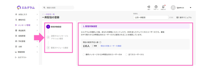 今回のアップデートでは、配信対象の選択、メッセージ内容の設定、配信条件の確認といった操作を、画面の案内に沿って順番に進めることで、スムーズに配信準備を行えるようになりました。