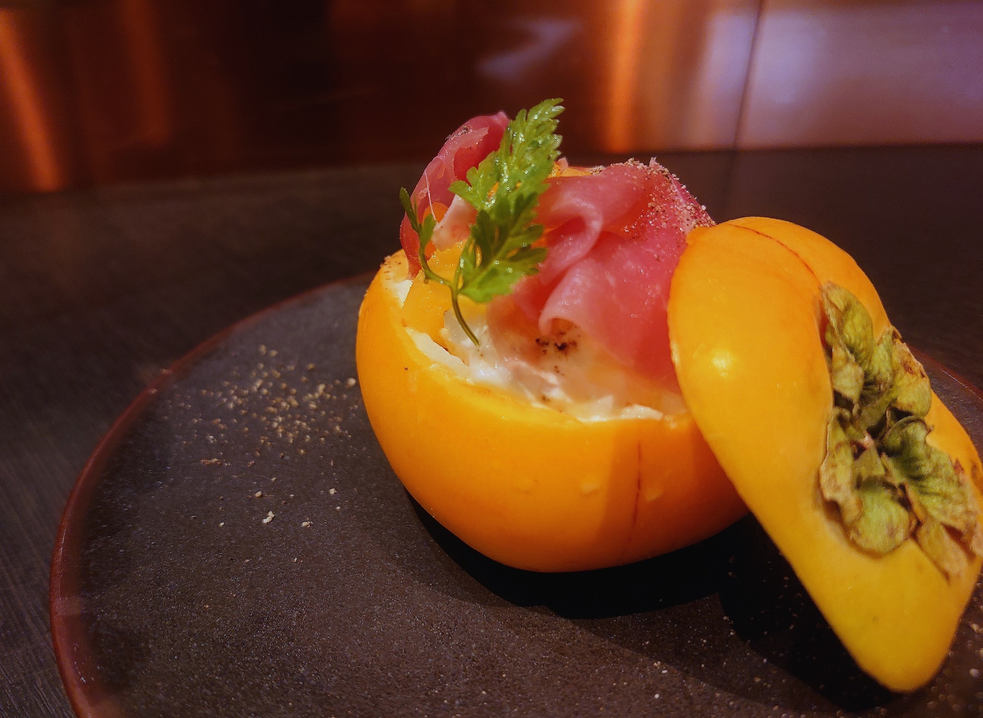 ・柿を丸ごと使った 生ハムとブラータチーズのカプレーゼ