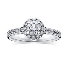 華やかな取り巻きとラインメレのアームが美しい光に満ちたエンゲージリング。