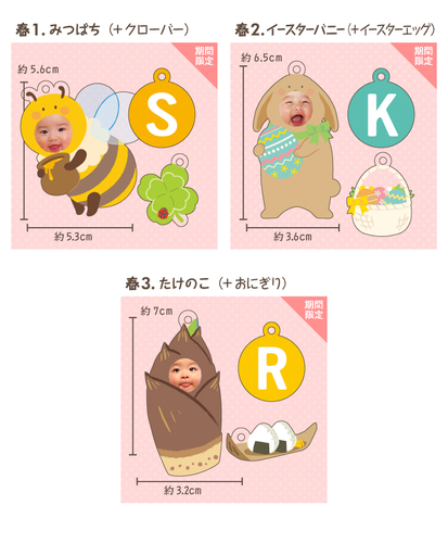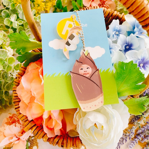 お子さまのお写真ときぐるみデザインを組み合わせて世界に一つだけオリジナルキーホルダーを作成致します。