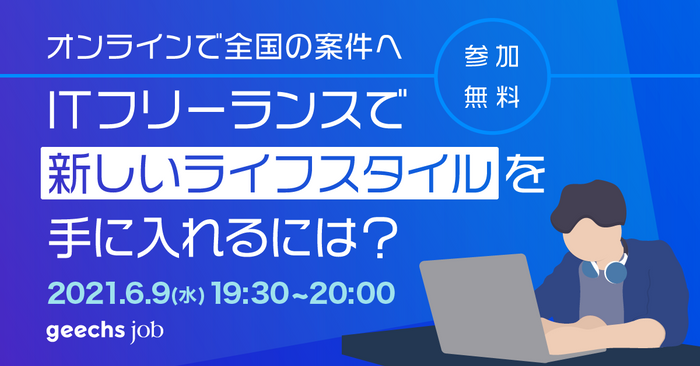 ギークス株式会社(本社:東京都渋谷区、代表取締役CEO:曽根原 稔人、以下ギークス)は、2021年6月9日(水)19:30~20:00にて、全国のITフリーランスを対象にしたオンラインセミナー「オンラインで全国の案件へ!ITフリーランスで新しいライフスタイルを手に入れるには?」を開催することをお知らせします。ギークスは、場所にとらわれない働き方を推進し、ITフリーランスが理想とするキャリアプラン・ライフスタイルの実現を目指す他、ITフリーランスと企業案件の地域を超えたマッチングを通じて、地方での就労機会の創出にも尽力します。
