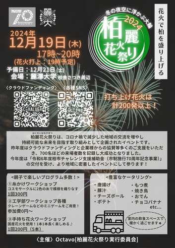 麗澤大学(千葉県柏市/学長:徳永澄憲)の有志学生8名は、約200発の花火を打ち上げる「第2回柏麗花火祭り」を12月19日(木)に麗澤大学キャンパス内で開催いたします。