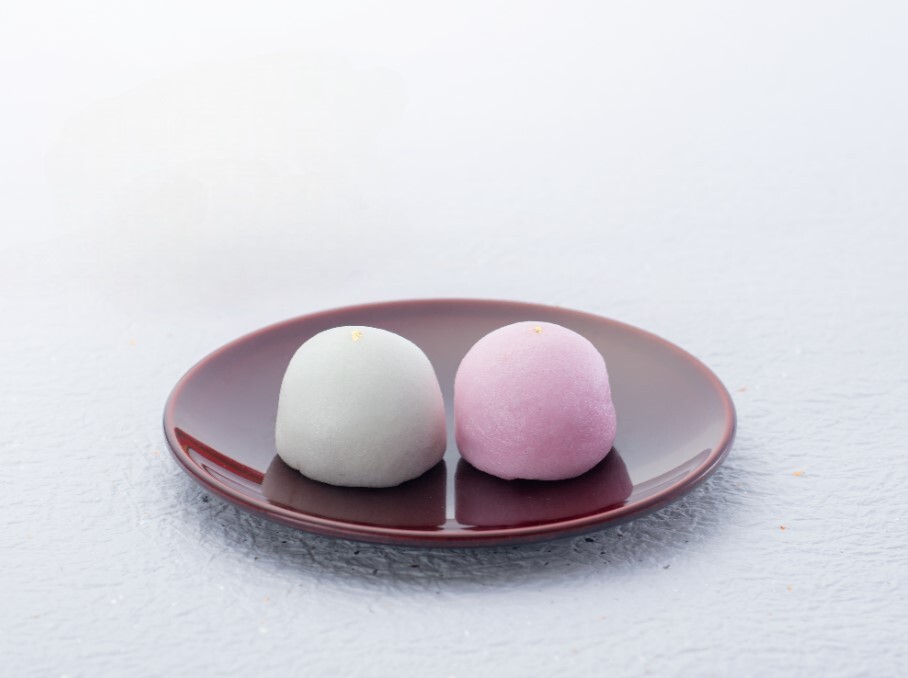 初春の寿ぎを感じる、紅白の薯蕷(じょうよ)まんじゅう。こしあん(紅)、粒あん(白)をしっとり蒸し上げた山芋生地で包み金箔を添えました。シンプルな素材の中に熟練の和菓子の技術が光ります。