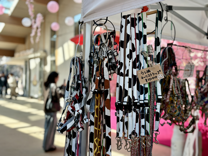 (左から)しあわせカラー(リード、ハーネス)、愛木楽社(うちの子お名前キーホルダー)、kururii(柴犬雑貨)、お菓子工房エータロー(スイーツ)、マルシェ近くのドッグラン春のフォットスポット