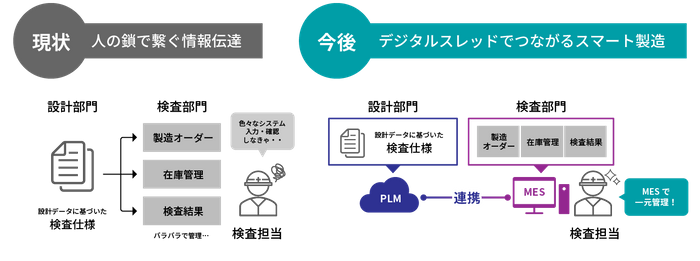 以上3点のさらなる体制強化をすべく、要求仕様と検査仕様を統一したデータモデルで管理できる PLM(Teamcenter X)システムと(Teamcenter X)、リアルタイムな製造プロセス管理ができるMES(Opcenter)を導入することとしました。