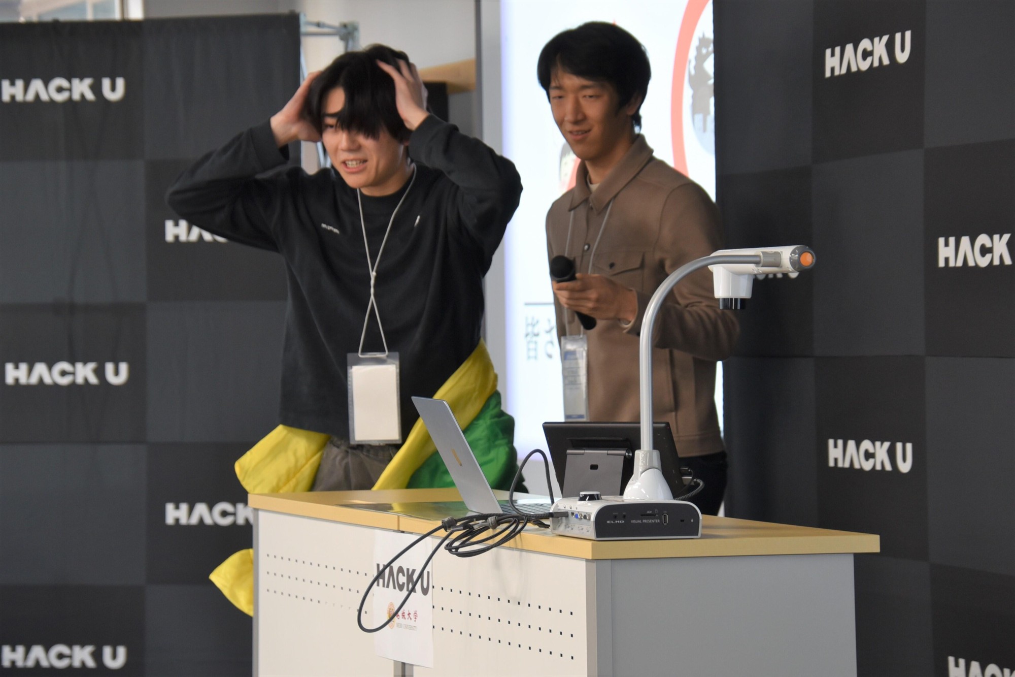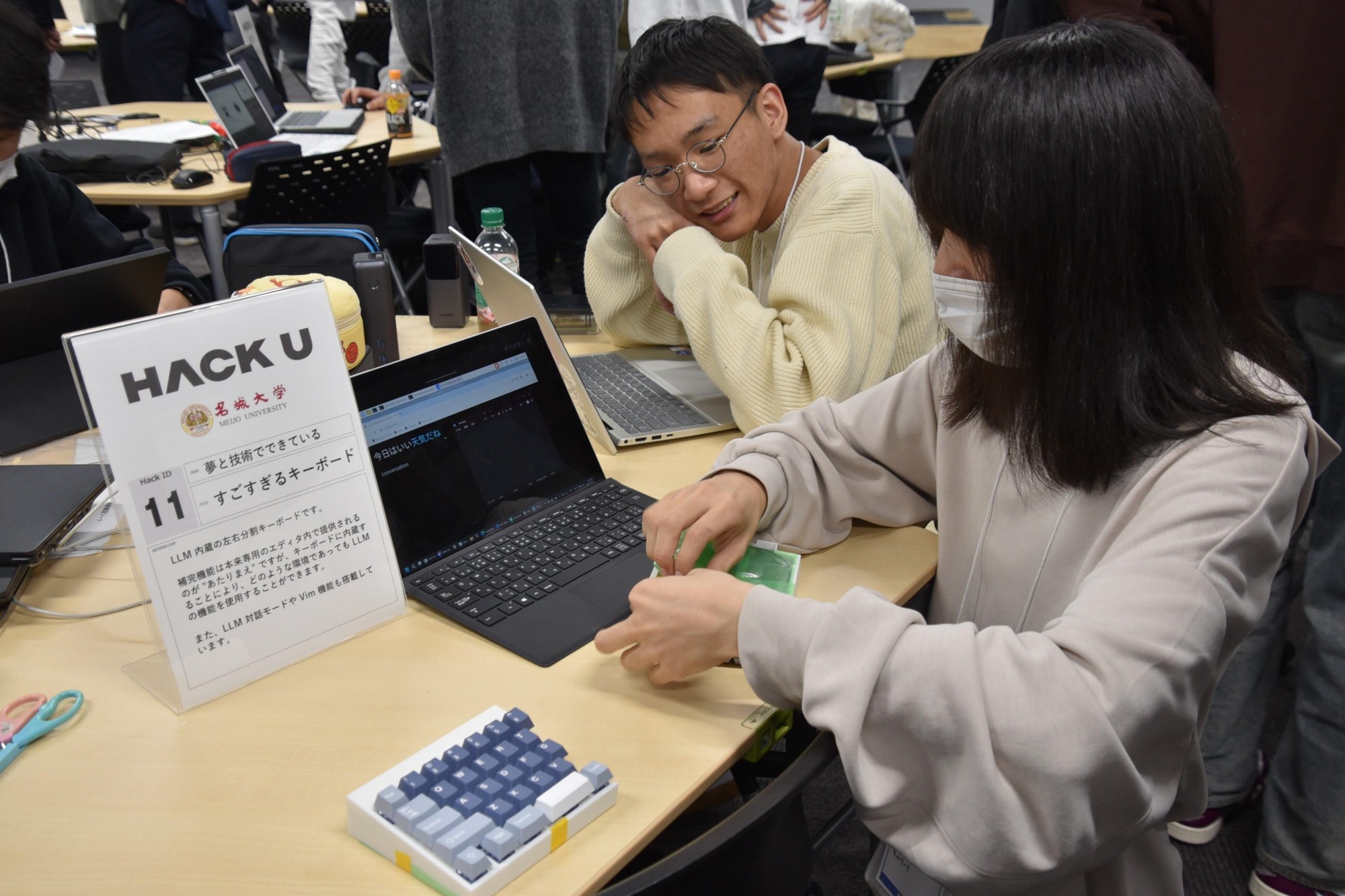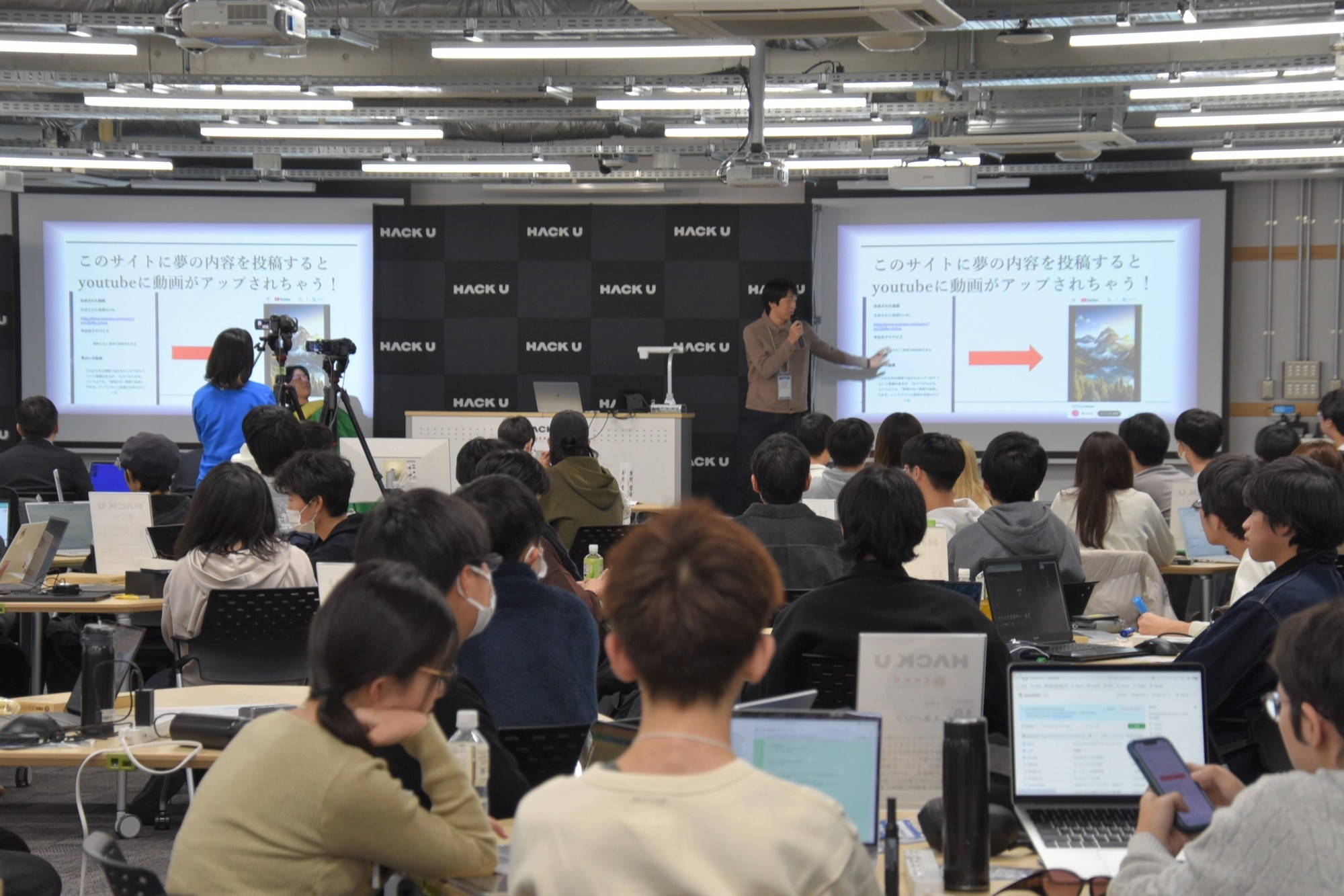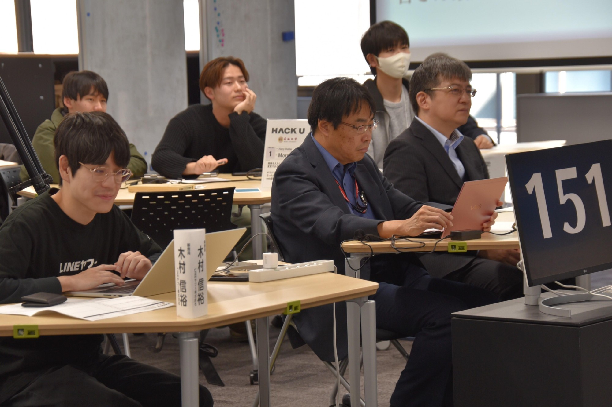 「LINEヤフー株式会社」が主催、本学が共催する「HACK U 名城大学」は、LINEヤフーの社員のサポートを受けながら、学部や学年の枠を超えたチームがプロダクトを開発するイベントです。本学が指定管理法人を務める愛知総合工科高等学校専攻科の学生も含めて20チーム、92人が参加し、11月10日からの約1カ月の開発期間を経て、この日の発表・審査会を迎えました。
