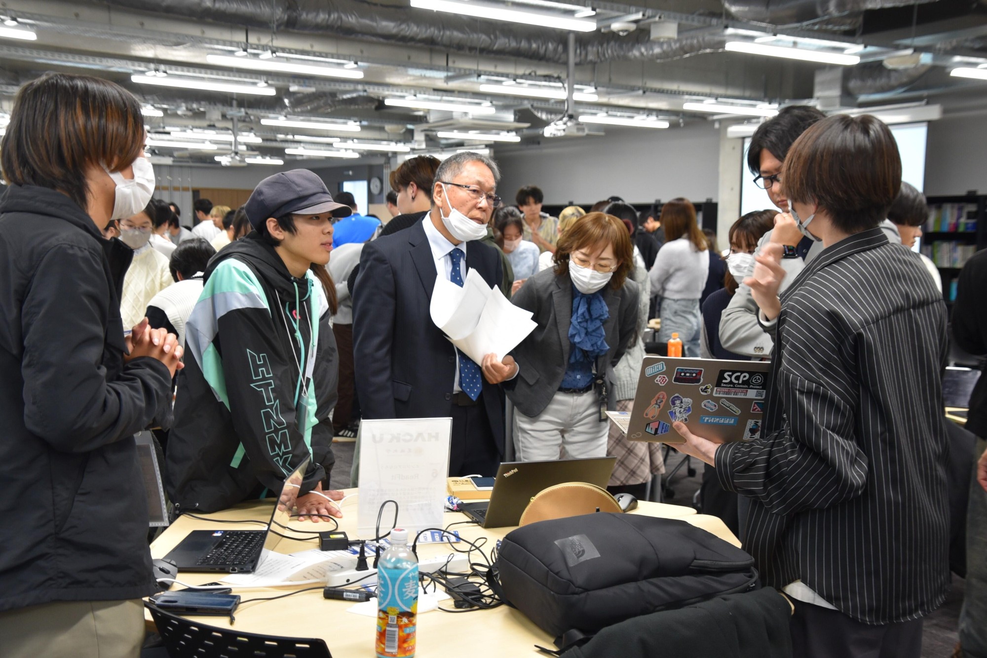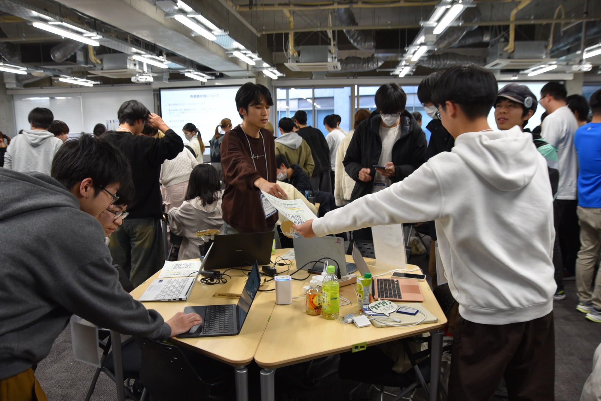 各チームはプレゼンで、課題を把握した背景やその解消に向けたサービスの機能、操作の方法、活用した技術仕様、今後の展開などをパワーポイントで簡潔に説明。さらにその後の展示会では、各チームのテーブルを回る審査員や他チームの学生、LINEヤフーの社員に、実際にスマホやパソコンの画面でアプリを起動させて操作したり、起業活動拠点ものづくりスペースM-STUDIOなどを活用して製作した試作品を動かしたりして、詳しい機能などの質問に答えていました。