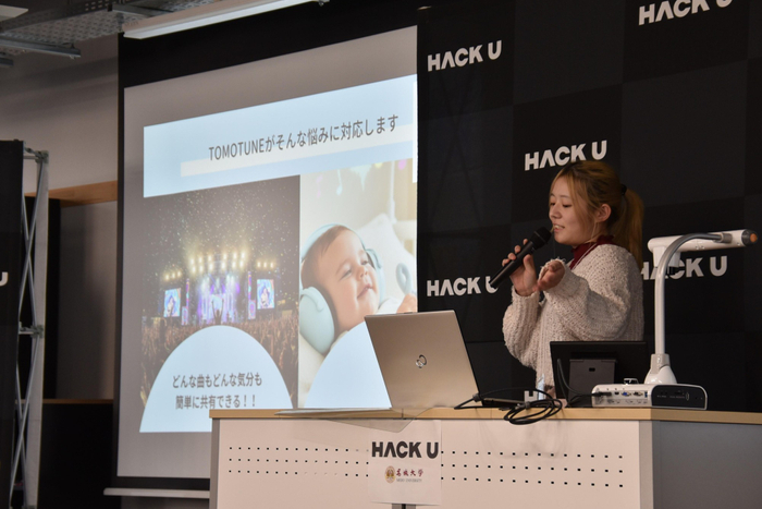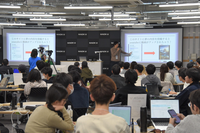 最終発表会では、審査員の野口光宣学長と社会連携センター長で経営学部の田中武憲教授、情報工学部の旭健作准教授、LINEヤフーの木村信裕さんを前に、各チームが180秒の制限時間内でプロダクトをプレゼン。見た夢を記入すると動画を作成してYou Tubeにアップされるサイトや、その日の気分や天気などから最適の音楽を提案するアプリ、大学祭などのデジタルパンフレットシステムなどのプロダクトを次々と発表しました。
