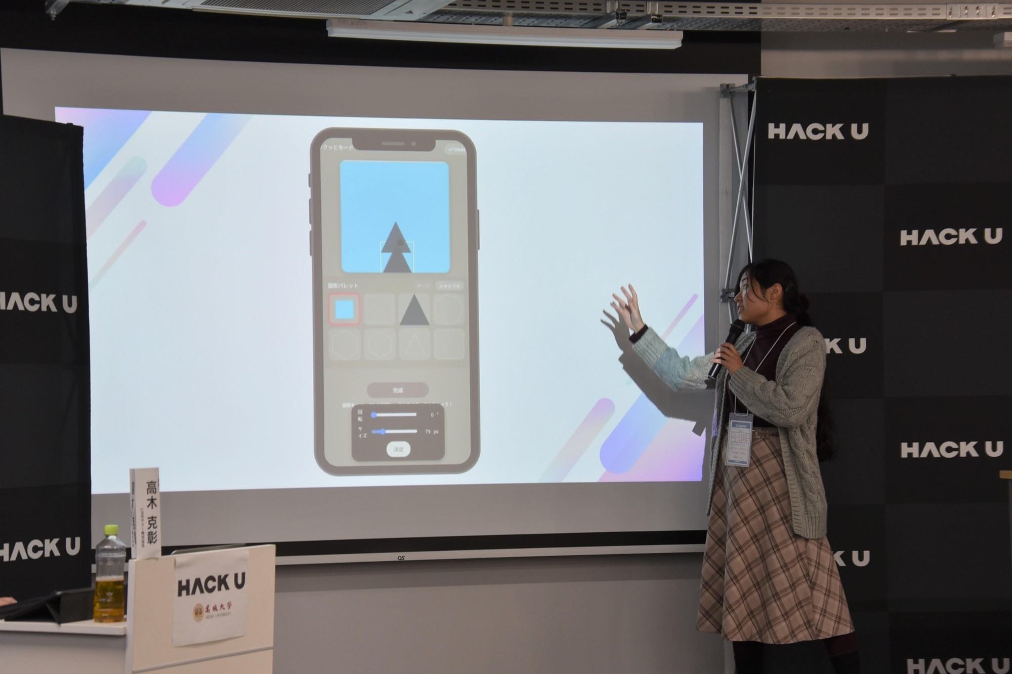 審査の結果、机の散らかり問題を楽しんで解決するため、机を片付けて撮った画像を解析してスコア化し、キャラクターを育成するアプリ「TSUKUPULA」を開発した「わーるど」が、最優秀賞とクオリティーが最も優れた作品に贈られる名城大学賞をダブルで受賞しました。
