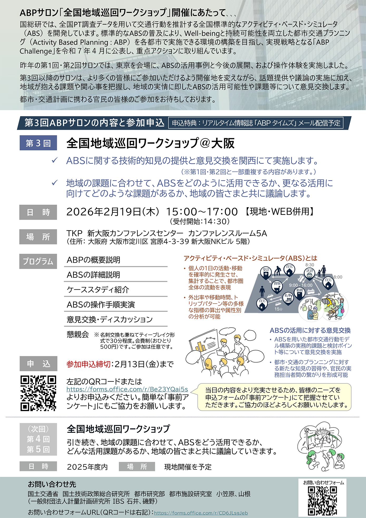 国土交通省 国土技術政策総合研究所(以下 国総研)では、都市における各個人の1日の活動・移動データをシミュレーション技術等により再現し、都市・交通計画等のプランニング技術に活用していく、官民共創プロジェクト「ABP Challenge(Activity Based Planning Challenge)」を策定し推進しています。2025年11月からは、ABPの実現に向けた官民のコミュニティ形成を進める場として、関連技術情報の提供や、関心層同士の交流の機会を提供する『ABPサロン』を継続開催しています。