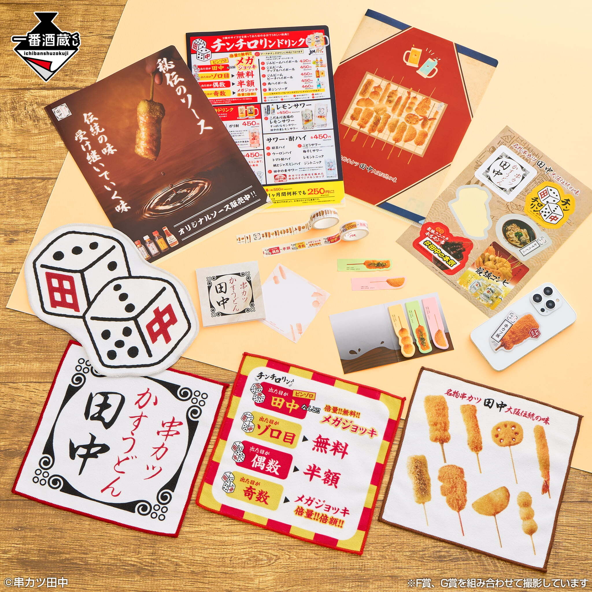 A賞はお店のちょうちんをイメージした、串カツ田中のロゴが入ったライトです。B賞はお店のチンチロリンが家でも楽しめる、サイコロとセットになったどんぶり。C賞はメニュー表がそのままビッグサイズになったインパクト大のタオルです。D賞は実際にお店で使用しているデザインを再現したジョッキ。E賞は本物の串カツを3Dスキャンして再現したミニチュアチャームです。おいしそうな揚げ加減にもこだわりました。そのほか、メニュー表やポスター、一番酒蔵くじオリジナルデザインの選べるステーショナリーアソートやお店のロゴやリアルな串カツの柄など、楽しいデザインに仕上げた選べるタオルコレクション、ラバーコースター・マーカーチャーム・クリップの日常で使えるラバーコレクションなどいずれも串カツ田中の魅力がいっぱいの一番酒蔵くじならではのアイテムをそろえました。