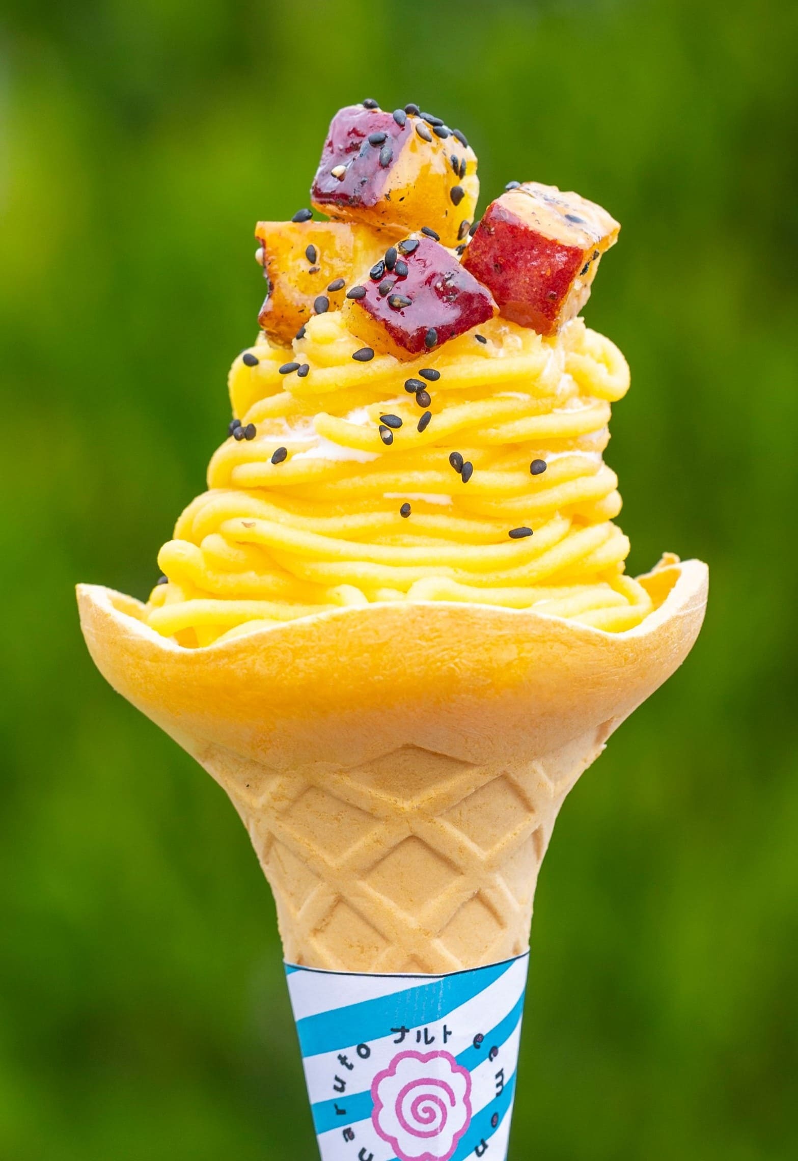 オープン以来人気ナンバー1のソフトクリーム。阿波和三盆糖蜜を使用したミルクソフトの周りに鳴門金時のモンブランを巻いて、上に大学芋をトッピング。暑い夏にピッタリの大満足メニューです。