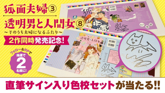双葉社岩飛猫X公式アカウント(@iwatobinekoFTB)にて、著者直筆サインが入った『透明男と人間女⑧』&『狐面夫婦③』の色校2枚セットが抽選で2名様に当たるキャンペーンを開催!