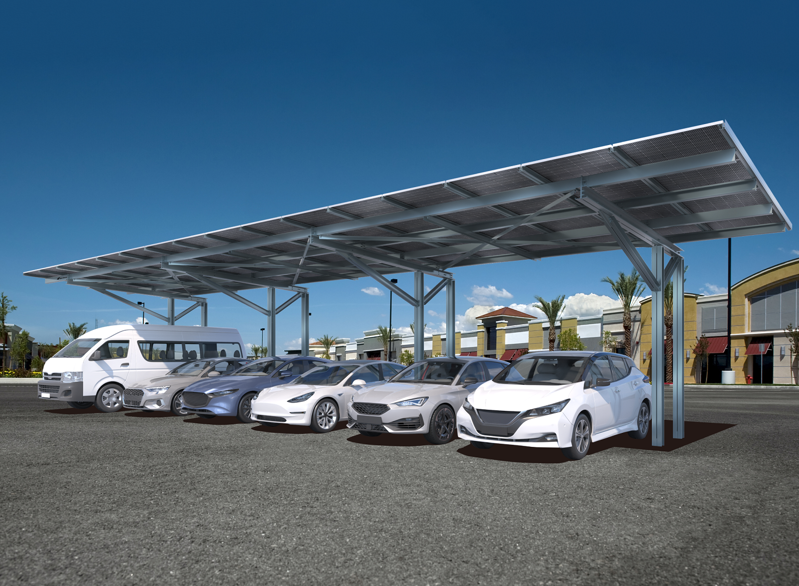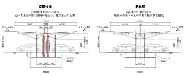 (2)柱が車体の前方に来ない、後方支持タイプのソーラーカーポートで多種多様な車両に対応