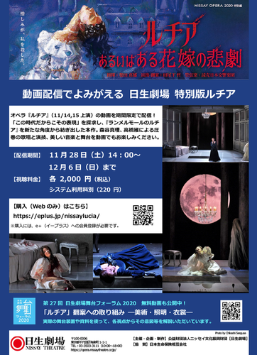 日生劇場にて、11 月 14 日(土)、15 日(日)に上演された NISSAY OPERA 2020 特別編 オペラ『ルチア~あるいはある花嫁の悲劇~』の動画を11月28日(土)~12月6日(日)の期間限定で好評配信中!動画視聴券発売中です。