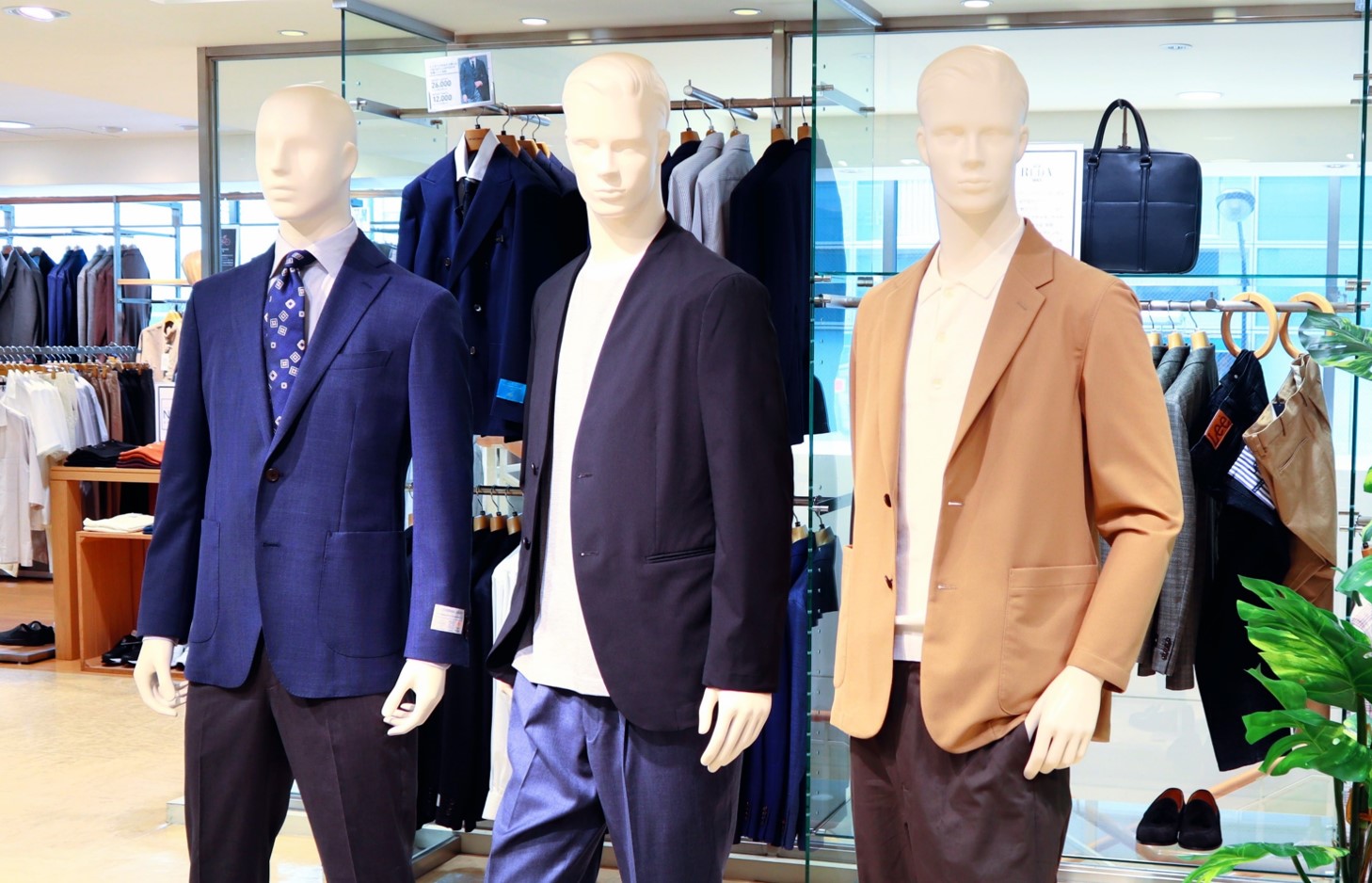 店内では、夏場におすすめのビジネススタイルを演出しています。今回提案する3タイプのジャケット以外にも各種ジャケットを取り揃えており、機能性や生地感など好みに合わせてお選びいただけます。また、インナーやパンツなど、コーディネートアイテムも豊富に企画し、ビジネスシーンに最適なアイテムを用意しています。