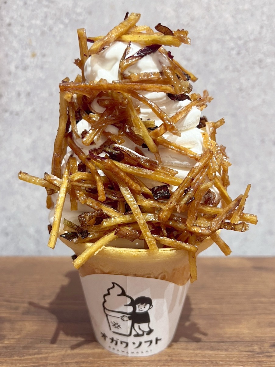 埼玉県産牛乳を使った濃厚なミルク感あるソフトクリームに期間限定の深谷ねぎけんぴを貼り付けました!ソフトをディップして食べても良しの甘辛スイーツが出来上がりました。